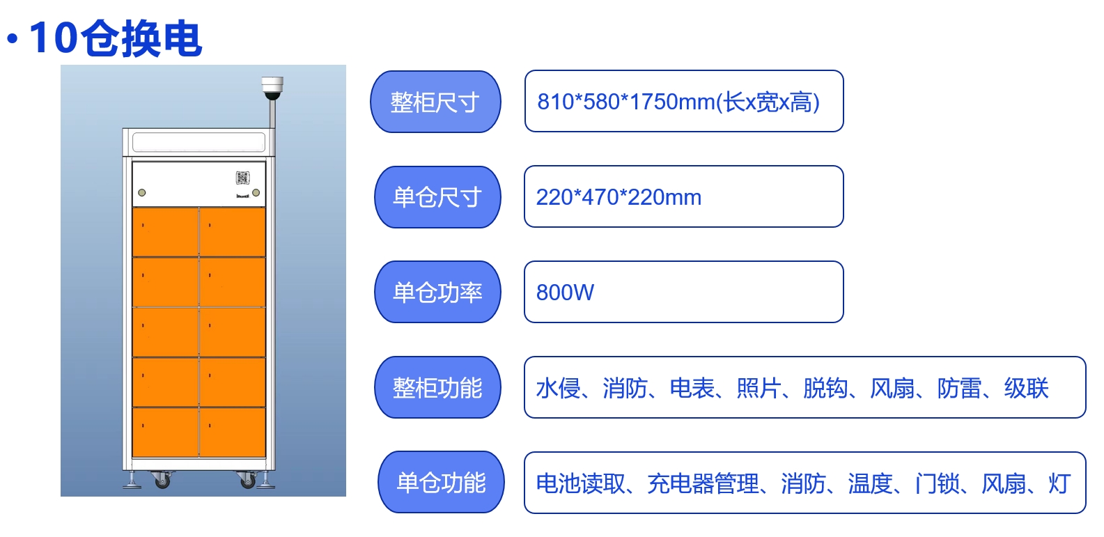 產(chǎn)品優(yōu)勢(shì) 我們采用linux主控系統(tǒng); 具有備快速換電功能; 具有柜體水侵,高溫,煙霧檢測(cè)消防管理功能; 具有柜體電量檢測(cè),門禁管理功能; 具有柜體溫度檢測(cè),自動(dòng)排風(fēng)散熱功能; 具有柜體溫度檢測(cè),倉(cāng)體消防功能; 具有實(shí)時(shí)倉(cāng)體溫控,倉(cāng)門鎖控,電池,充電器,狀態(tài)指示,排風(fēng)散熱,加熱,消防等管理功能。