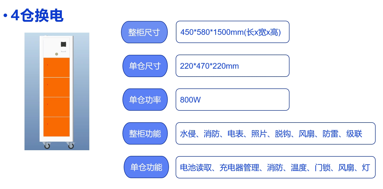 產(chǎn)品特點(diǎn) 速 度 快:換電僅需10秒,無需等待,即刻出發(fā); 操作便捷:小程序掃碼換電,輕松一掃,簡(jiǎn)單方便;安全性高:遠(yuǎn)離充電不當(dāng)帶來的安全隱患,有氣溶膠/水消防兩種不同的裝置為換電過程保駕護(hù)航; 電池維護(hù):提供統(tǒng)一電池維護(hù)及保養(yǎng)服務(wù),無需考慮購(gòu)買新電池及廢舊電池更換等問題:換電方式:智能換電系統(tǒng); 充電方式:1000W,750W大功率充電快; 電池保管:GPS+GPRS雙重定位,一切盡在掌握中換電柜適用范圍: 適用類型:兩輪電動(dòng)車、三輪電動(dòng)車、電動(dòng)助力車: 顏色外型:可定制。