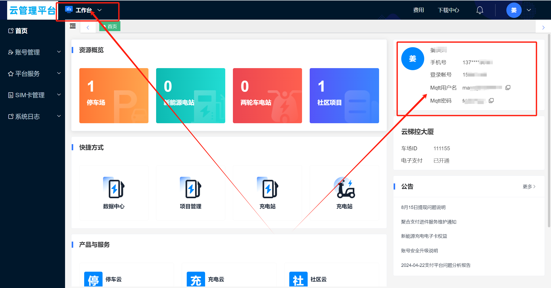 3、鏈接泊鏈云MQTT服務(wù)器地址:119.23.221.49,端口:1883,用戶名和密碼請登錄泊鏈平臺,工作臺查看。