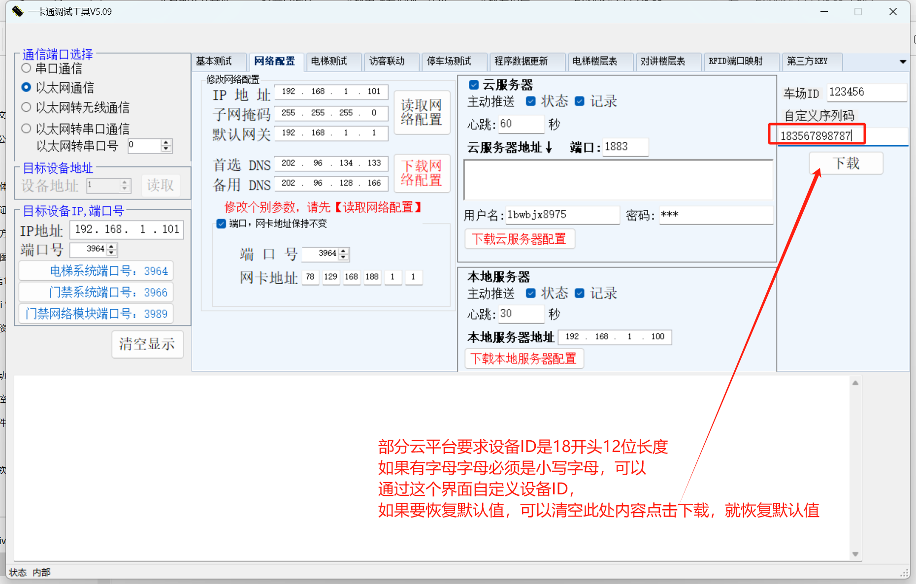 4、倍賀云平臺(tái)要求設(shè)備ID是18開頭12位長(zhǎng)度,如果有字母字母必須是小寫字母,可以通過(guò)這個(gè)界面自定義設(shè)備ID,如果要恢復(fù)默認(rèn)值,可以清空此處內(nèi)容點(diǎn)擊下載,就恢復(fù)默認(rèn)值。